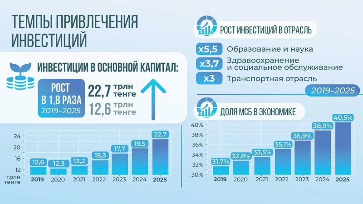 За семь лет объем инвестиций в основной капитал вырос с 12,6 трлн тенге до 22,7 трлн тенге. При этом существенно изменилась их структура: основной приток средств направляется в обрабатывающую промышленность, инфраструктуру, энергетику, логистику и агропромышленный комплекс.