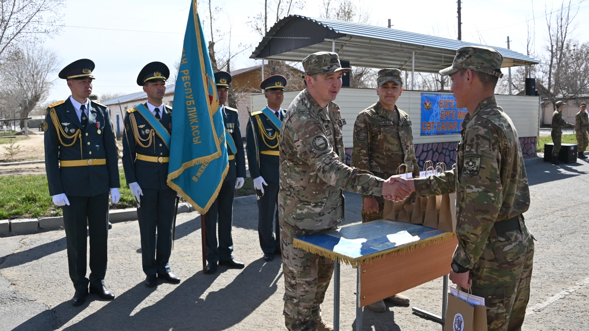 На торжественном собрании выступил командир части подполковник Еркин Жоламанов, который поблагодарил военнослужащих, добросовестно и ответственно выполнивших воинский долг.
