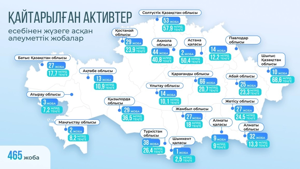 Бұл ретте жаңадан салынған әлеуметтік және инфрақұрылымдық нысандардың бір бөлігі қайтарылған активтер есебінен қаржыландырылып жатқанын атап өту аса маңызды. Өйткені бұл бюджетке салмақ салмай, өткір проблемаларды жедел шешуге мүмкіндік берді.