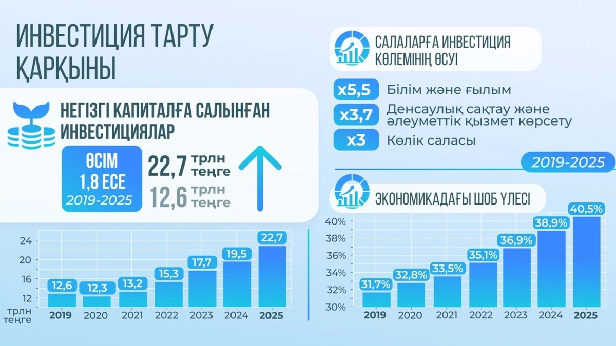 Жеті жыл ішінде негізгі капиталға салынған инвестициялар көлемі 12,6 трлн теңгеден 22,7 трлн теңгеге дейін өсті. Оның үстіне құрылымы да айтарлықтай өзгерді: қаржының негізгі бөлігі өңдеуші өнеркәсіпке, инфрақұрылымға, энергетикаға, логистика мен агроөнеркәсіп кешеніне бағытталып отыр.